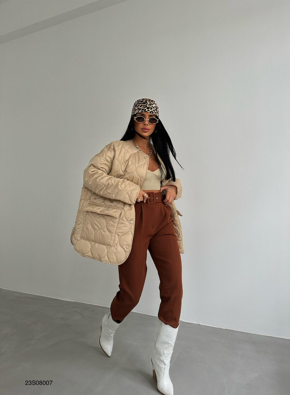 7. Beige Puffer Jacket Over Sweater and Black Pants